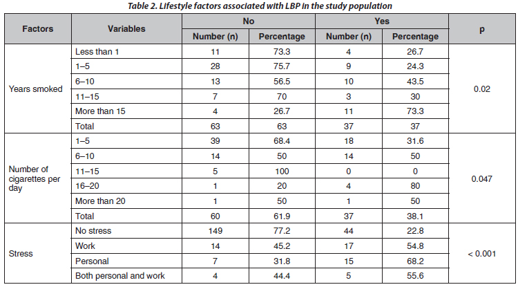 Background. Occupational-related lower back pain (LBP) has received growing attention, especially regarding its effect on work productivity and disability. Construction workers (CWs) are involved in one of the most physically demanding occupations, making them exceedingly susceptible to LBP. The objective was to determine LBP’s prevalence and identify selected risk factors among CWs within the eThekwini Municipality in KwaZulu-Natal, South Africa. Materials and methods. A cross-sectional survey was conducted on 256 CWs, and questionnaires were provided to participants at their respective companies. The questionnaire included sections on demographics, lifestyle, occupational risk factors, and LBP history. IBM SPSS version 28 was used to analyze the data. A p-value of < 0.05 was used to indicate statistical significance. Both point prevalence (occurrence of LBP at the time of the survey) and period prevalence (occurrence of LBP over the past six months) were analyzed. Results. The point and period prevalences were 16.8 and 26.2 %, respectively. The results indicated that 36.6 % of current smokers reported LBP, with a higher incidence of 73.3 % among those smoking for over 15 years. Stress emerged as a significant factor; 54.8 % of subjects experiencing work-related stress and 68.2 % under personal stress reported LBP, contrasted with only 22.8 % of those experiencing no stress. Scaffolders exhibited a higher LBP prevalence (50 %) than general workers (43.2 %), erectors (33.3 %), and bricklayers (30.5 %). Conclusions. LBP continues to be a significant health burden for CWs, impacting their daily activities and causing disability. Therefore, a joint intervention strategy between health professionals and the construction industry is required. This will reduce absenteeism, stress, decreased productivity and activity limitations.