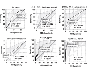 Актуальність. На сьогодні існує невирішене питання персоналізованої діагностики та предикції ризиків розвитку фенотипів атопічних хвороб (АХ) та атопічного маршу (АМ) у дітей. Метою поданого дослідження була розробка інтегральної моделі персоналізовано-прецизійної предикативної генотип-асоційованої діагностики щодо ризику розвитку олігоорганного та поліорганних фенотипів (ООФ, ПОФ) АМ у дітей. Матеріали та методи. У дослідження були залучені 68 дітей віком від 3 до 18 років: 21 — до основної групи; 47 — до контрольної групи. Критеріями включення до основної групи були АХ у комбінаціях атопічного дерматиту (АД), алергічного риніту або ринокон’юнктивіту (АР/АРК) і/або бронхіальної астми (БА): АД+АР/АРК, БА+АР/АРК, АД+АР/АРК+БА. Критерії включення до контрольної групи: функціональна і/або органічна патологія травної системи, відсутність АХ. Усім дітям було зроблено генотипування на варіанти однонуклеотидних варіацій (SNV) rs7927894 гена філагрину (filaggrin — FLG) і rs7216389 гена оросомукоїд-1-подібного білка 3 (orosomucoid-like 3 — ORMDL3) і визначено концентрації в сироватці крові біомаркерів: рутинного загального імуноглобуліну Е (IgE) і новітнього біомаркера-кандидата, кутанного Т-клітинного атрактивного хемокіну (cuteaneous t-cell attracting chemokine — CTACK/CCL27). Результати. Були отримані такі функціональні значення предикторів ризику розвитку ООФ і ПОФ АМ у дітей: вік дитини ≤ 11 років — співвідношення шансів (СШ) з 95% довірчим інтервалом (95% ДІ) становило 3,74 (1,09–12,8), р = 0,025; гетерозиготний генотип С/Т rs7927894 FLG — 2,88 (0,99–8,38), р = 0,051; гомозиготний генотип Т/Т rs7216389 ORMDL3 — 5,19 (1,61–16,8), р = 0,051; комбінація генотипів С/Т rs_7927894 FLG + Т/T rs_7216389 ORMDL3 — 5,87 (1,30–26,42), р = 0,017; концентрація в сироватці крові CTACK/CCL27 ≥ 4308,8 пг/мл — 7,4 (2,35–23,26), р < 0,001; концентрація в сироватці крові загального IgE ≥ 213 МО/мл — 136,7 (15,4–1213,2), р < 0,001. Надалі були отримані діагностичні коефіцієнти (ДК) для моделі персоналізованої предикативної генотип-асоційованої діагностики ризику розвитку ПОФ АМ у дітей (за рангом): 1 — загальний IgE ≥ 213 МО/мл — ДК = +8,7; 2 — CTACK/CCL27 ≥ 4308,8 пг/мл — ДК = +5,0; 3 — Т/T rs_7216389 ORMDL3 — ДК = +5,0; 4 — С/Т rs_7927894 FLG + Т/T rs_7216389 ORMDL3 – ДК = +6,5; 5 — С/Т rs7927894 FLG — ДК = +2,8; 6 — вік ≤ 11 років — ДК = +1,8. Пороговим значенням суми ДК було визначено > 11,8 бала: при значенні 0–6,8 бала ризик розвитку ПОФ АМ у дітей був дуже низьким, при 7,8–9,6 бала — низьким, при 10–11,8 бала — підвищеним, при 12,8–14,6 бала — високим і при ≥ 15,5 бала — дуже високим. Висновки. Для персоналізовано-прецизійної предикції ризику розвитку олігоорганних і/або поліорганних фенотипів АМ у дітей пропонується застосування генотип-асоційованої інтегральної моделі, яка включає широкий спектр факторів-предикторів, як-от: загальнобіологічний — вік дітей до 11 років; генетичні — генотипи С/Т rs7927894 FLG, Т/Т rs7216389 ORMDL3; біохімічні — рівні сироваткових концентрацій загального IgE ≥ 213 МО/мл і CTACK/CCL27 ≥ 4308,8 пг/мл. Пороговим значенням підвищеного ризику розвитку даних фенотипів у дітей є сума ДК > 11,8 бала.