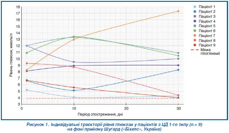 Складність патогенезу цукрового діабету та необхідність терапії протягом всього життя обумовлюють потребу в пошуку безпечних і ефективних додаткових засобів підтримки метаболічного контролю. Нутрицевтики з доведеною гіпоглікемічною активністю є перспективним напрямком цієї додаткової складової. З огляду на багатофакторність цукрового діабету використання дієтичної добавки Шугард («Біхелс», Україна), до складу якої входять рослинні компоненти, піколінат хрому та вітамін D, впливає на основні патогенетичні ланки захворювання, зокрема постпрандіальну глікемію, секрецію інсуліну, інсулінорезистентність та запальні процеси. Клінічні спостереження підтвердили її безпеку у стандартному дозуванні як доповнення до основної терапії, без значних побічних ефектів і коливань глікемії. Водночас для остаточного підтвердження ефективності та довгострокової безпеки необхідні масштабніші та триваліші дослідження, зокрема контроль глікованого гемоглобіну, біохімічних та антропометричних показників.